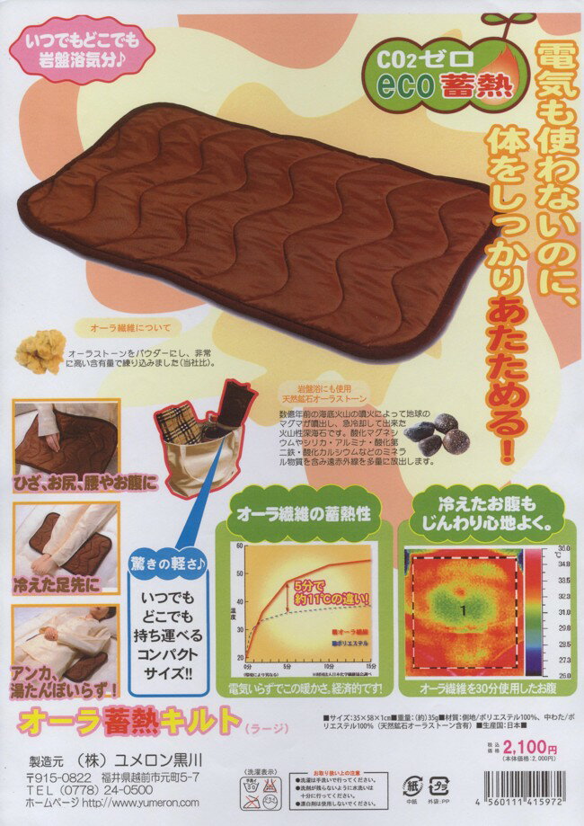 [商品特徴] : 【メール便送料無料】「オーラ蓄熱キルト」は、岩盤浴で使われている天然鉱石を練り込んだオーラ繊維でできたマットです。オーラ蓄熱キルトで寒い冬もいつでもポカポカ。寒さ対策にお役立てくださいひざ・お尻・腰や・・・・・・・・・・