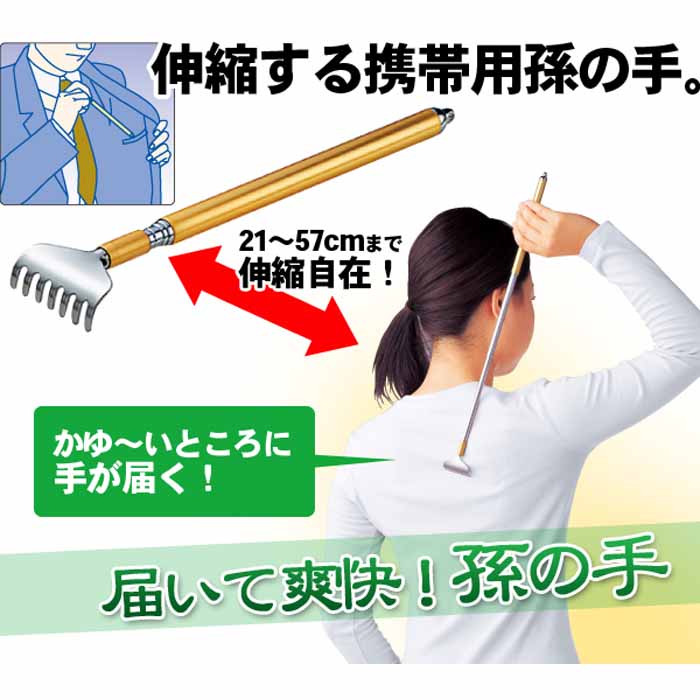 [商品特徴] : 伸縮する、携帯用孫の手。かゆーいところに手が届く♪■商品サイズ 収縮時:全長約21cm 伸長時:全長約57cm ■重量 約60g ■原産国 台湾 ■材質・成分 ステンレス、真鍮 *メール便 注意事項代・・・・・・・・・・